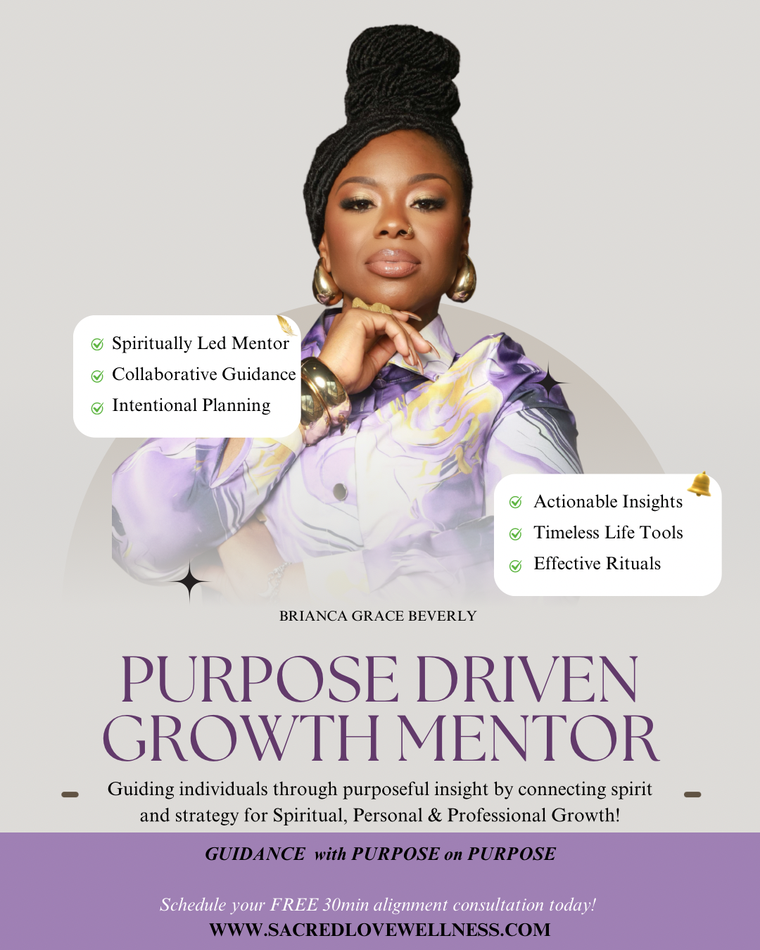 Are you feeling stuck or stagnant in your growth and seeking guidance to unlock your full potential? SCHEDULE your FREE alignment consultation for my Purpose-Driven Growth Mentorship Program to embark on a transformational journey that harmonizes spiritual strategy with your personal, spiritual, and professional life. Let's ignite your passion and open paths to your success together!